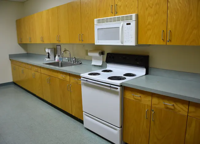 Galley kitchen with stove (For warming ONLY: No cooking may take place in the kitchen); a refrigerator, microwave and sink